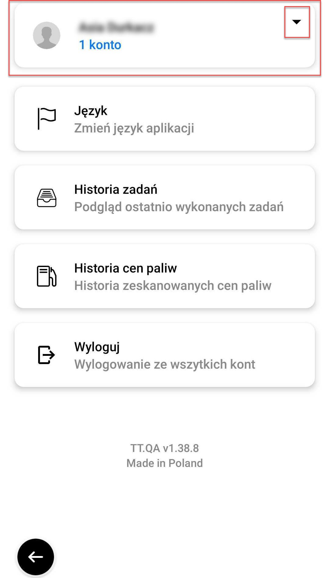 Next, you can see a tab with your username, where you are currently logged in and the number of accounts. To expand the tab, click on the black arrow on the right: